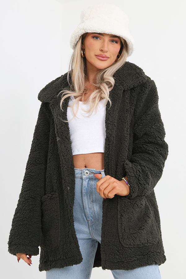 Khaki Green Soft Shaggy Fleece Open Jacket