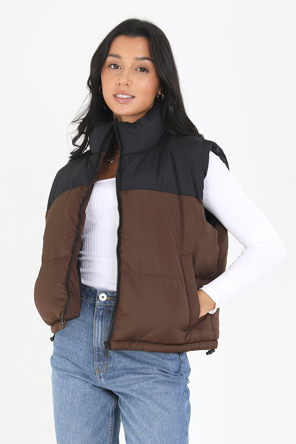 Ladies Chocolate/Black High Neck Colour Block Gilet