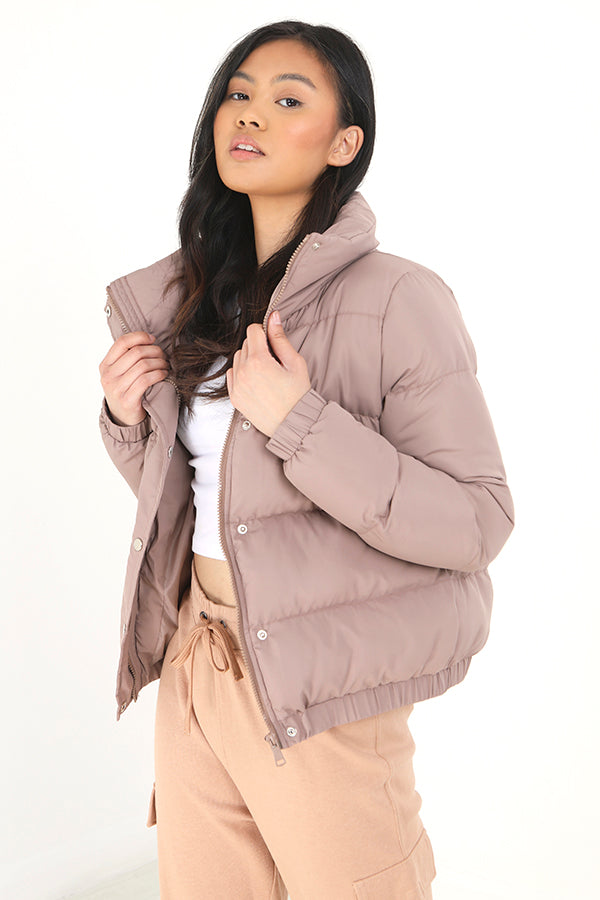 Ladies Taupe High Collar Snap Detail Puffer Jacket