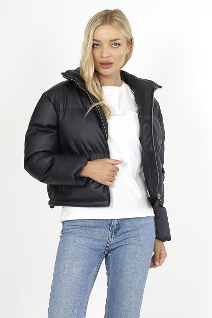 Ladies Black Matte Pu High Neck Puffer Jacket