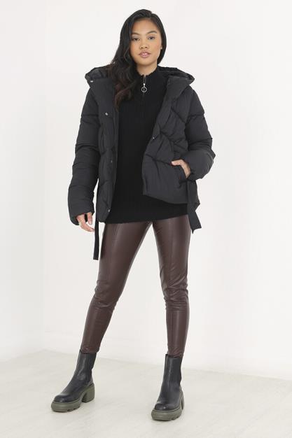 Ladies Black Hooded Waist Belt Detail Padded Jacket