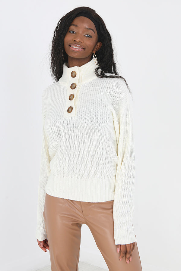 Ladies High Neck Button Detail Fisherman Knit Jumper