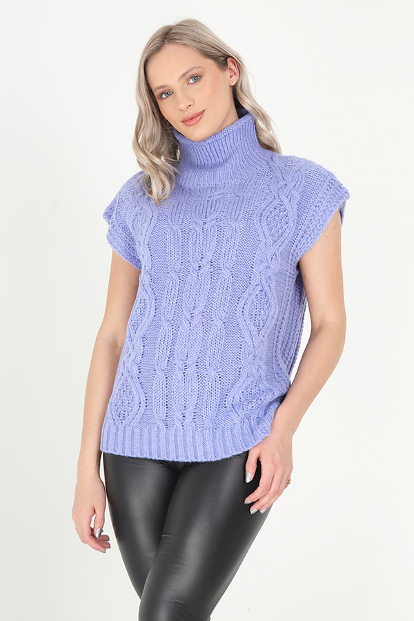Ladies Blue Dropped Shoulder Roll Neck Cable Knitted Tank